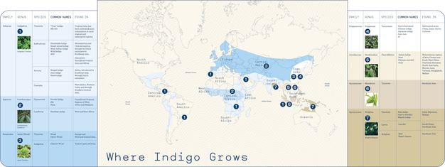 It is misleading to talk about one indigo plant when there are, in fact, several genera (the category between species and family) of plants from which one can extract different concentrations of indigo dyestuff. These plants grow all over the world, leading cultures to independently discover indigo and its uses. Although the plants look different from one another, the end product has the exact same chemical signature, therefore we are unable to identify which specific plant was used to create the dye. Often the exact genera are deduced based on the period and region in which the object was created.